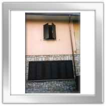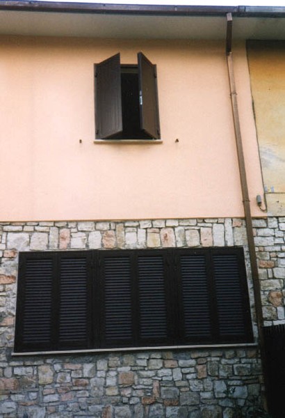 A destra un intervento di ristrutturazione con sportelloni rivestiti in legno, colore verde bosco. Il rivestimento, specifico per esterni, è fissato con nostro procedimento a viti e colle speciali, che garantiscono tenuta in ogni condizione, ed una estetica perfetta. La parte in acciaio presenta una blindatura doppia centrale, serratura per cilindro profilo europeo a tre punti di serraggio, cerniere su cuscinetti a sfere, robusti rostri al lato cerniere, ante semifisse con doppi paletti di chiusura (autonoma), barra inferiore trapassata dai catenacci di sicurezza, con battuta inferiore delle ante a protezione dei catenacci stessi: in una parola...la sicurezza ai massimi livelli!